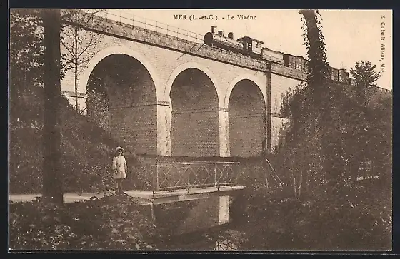 AK Mer, Le Viaduc avec un train passant au-dessus et une personne sur le pont en dessous
