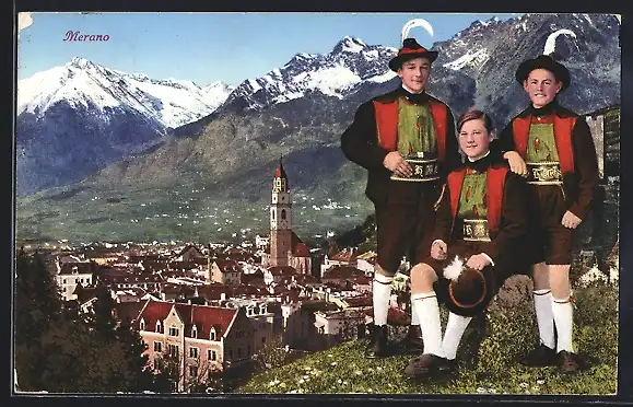 AK Meran, Ortsansicht mit Trachtenbuben und Bergkulisse