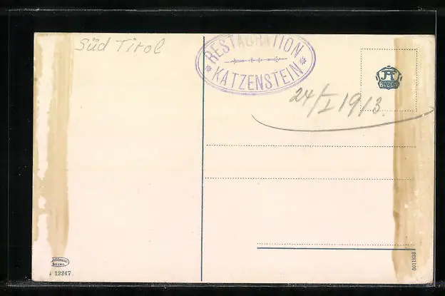 Personenbezogene Daten auf der Rückseite der Karte wurden durch blauen Textmarker unkenntlich gemacht. Die blauen Stellen sind auf die Vorderseite durchgeweicht und wirken sich negativ auf das Postkartenfoto aus
