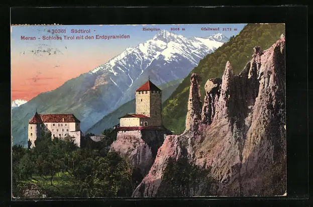 AK Meran, Schloss Tirol mit den Erdpyramiden
