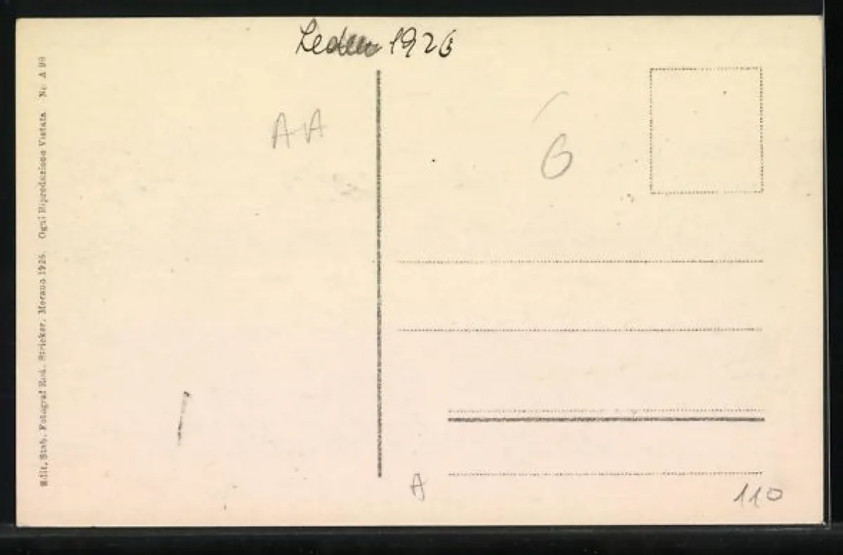 Personenbezogene Daten auf der Rückseite der Karte wurden durch blauen Textmarker unkenntlich gemacht. Die blauen Stellen sind auf die Vorderseite durchgeweicht und wirken sich negativ auf das Postkartenfoto aus