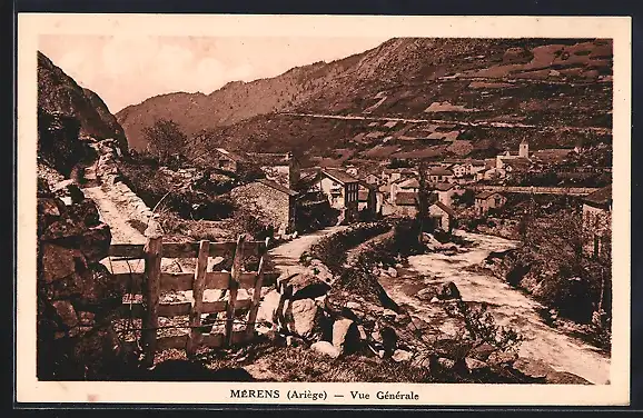 AK Mérens, Vue générale du village et de la rivière en Ariège