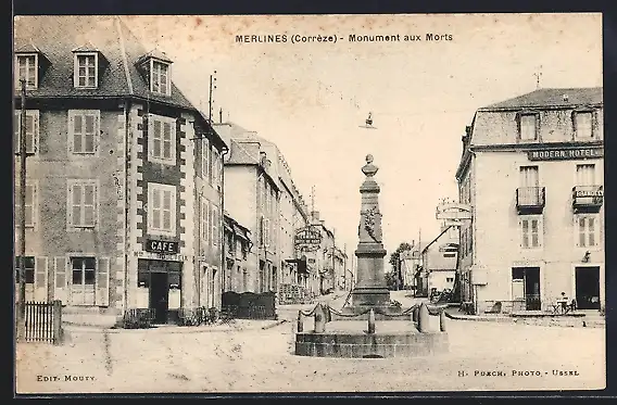 AK Merlines, Monument aux Morts et vue de la place centrale