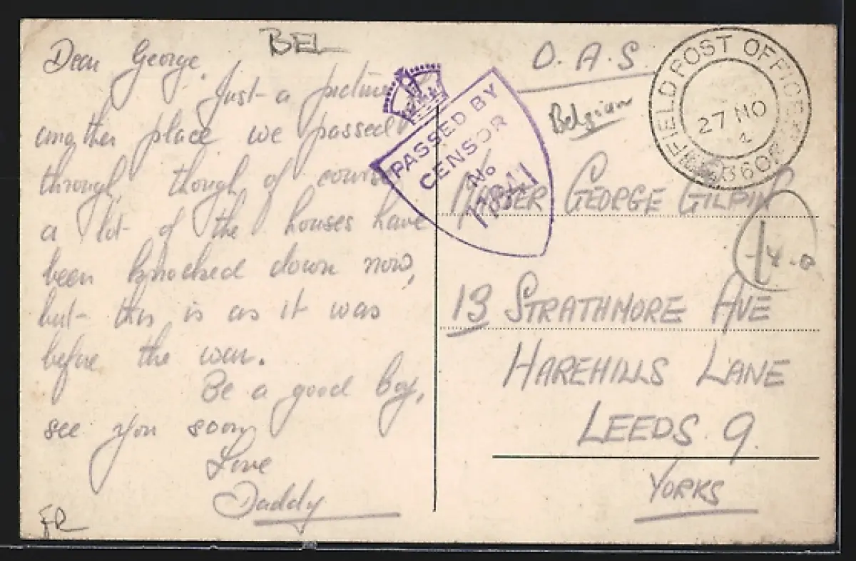 Personenbezogene Daten auf der Rückseite der Karte wurden durch blauen Textmarker unkenntlich gemacht. Die blauen Stellen sind auf die Vorderseite durchgeweicht und wirken sich negativ auf das Postkartenfoto aus
