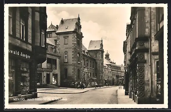 AK Merzig, Strasse mit Geschäften, Stadthaus