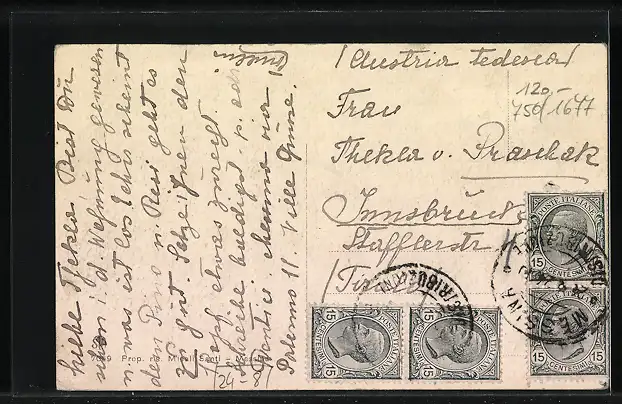 Personenbezogene Daten auf der Rückseite der Karte wurden durch blauen Textmarker unkenntlich gemacht. Die blauen Stellen sind auf die Vorderseite durchgeweicht und wirken sich negativ auf das Postkartenfoto aus