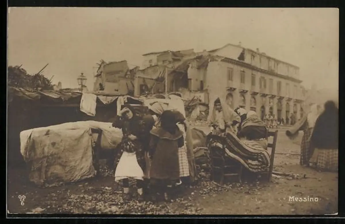 AK Messina, Menschen vor Ruinen nach Erdbeben