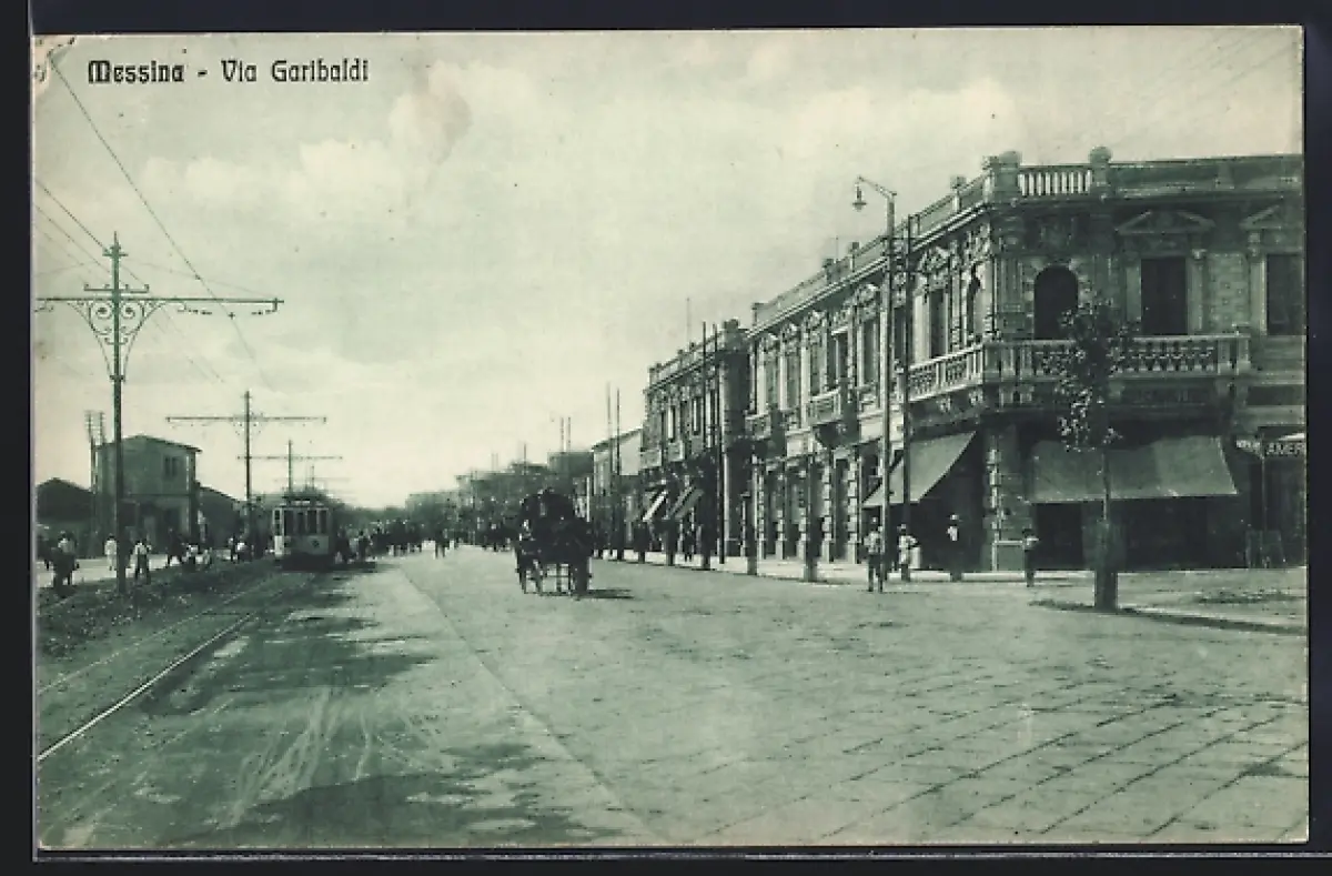 AK Messina, Via Garibaldi, Strassenansicht mit Strassenbahn