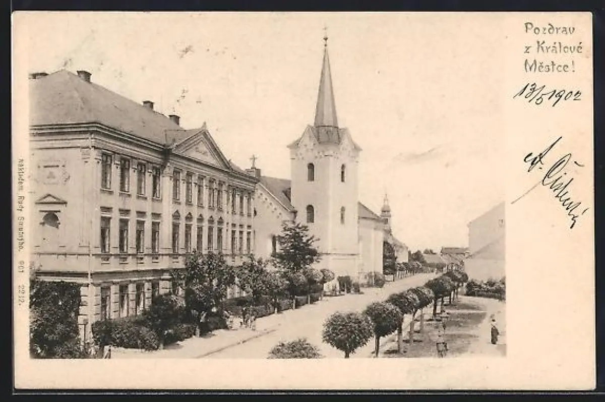 AK Mestec Kralove, Strassenpartie mit Kirche und Passanten