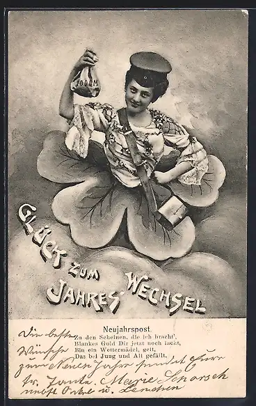 AK Metamorphose, Frau mit 100 DM-Säckchen als Kleeblatt-Neujahrpost