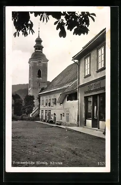 AK Metnitz /Kärnten, Strassenpartie mit Gemischtwarenhandlung Josef Lampl und Kirchturm