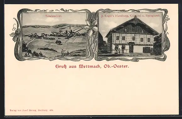AK Mettmach, Handlung von J. Engels mit Glaserei und Spenglerei, Ortsansicht
