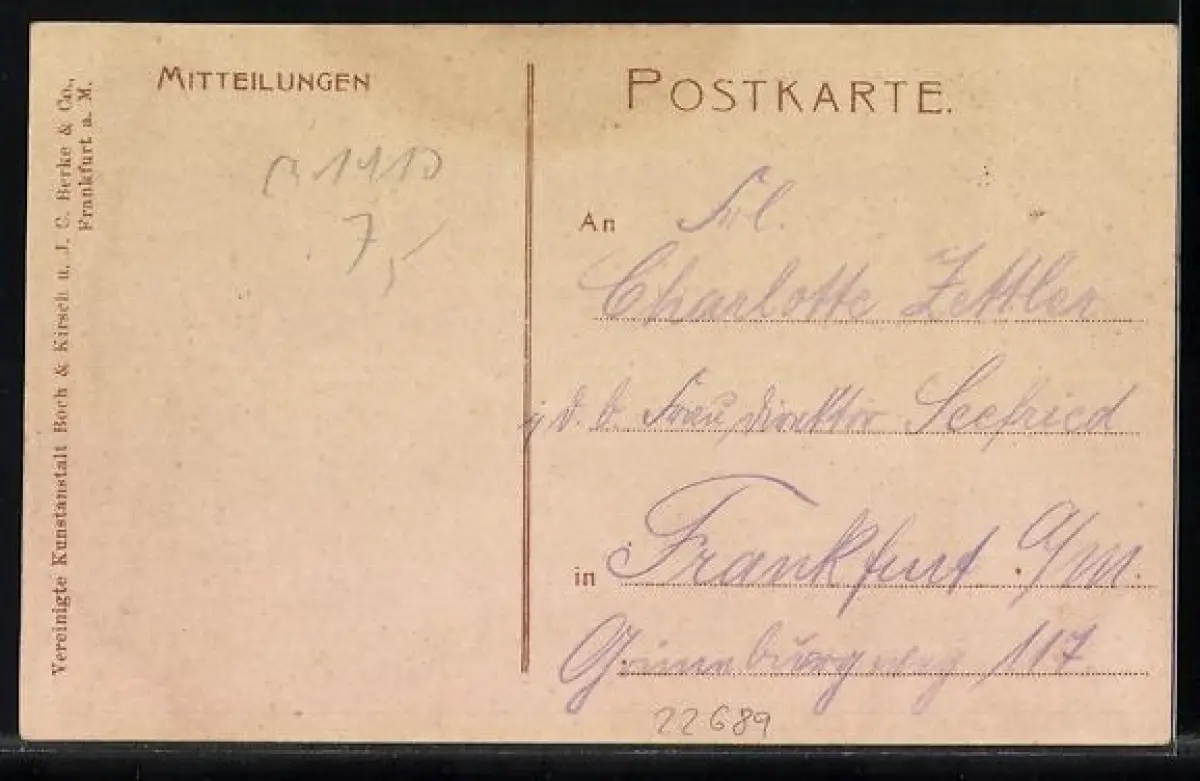 Personenbezogene Daten auf der Rückseite der Karte wurden durch blauen Textmarker unkenntlich gemacht. Die blauen Stellen sind auf die Vorderseite durchgeweicht und wirken sich negativ auf das Postkartenfoto aus