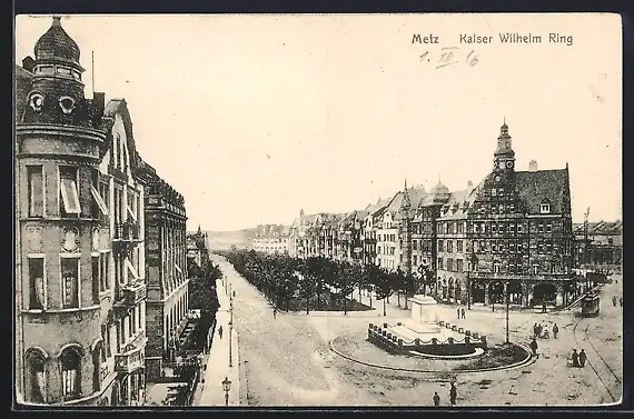 AK Metz, Kaiser Wilhelm Ring mit Strassenbahn und Denkmal