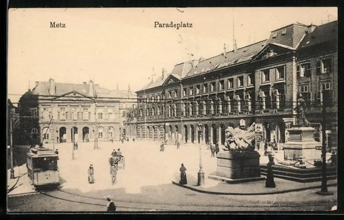 AK Metz, Paradeplatz mit Denkmal und Strassenbahn