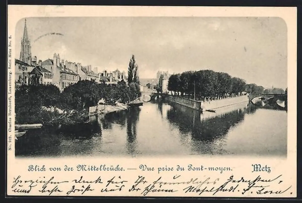AK Metz, Vue prise du Pont-moyen sur la rivière avec arbres et bâtiments adjacents