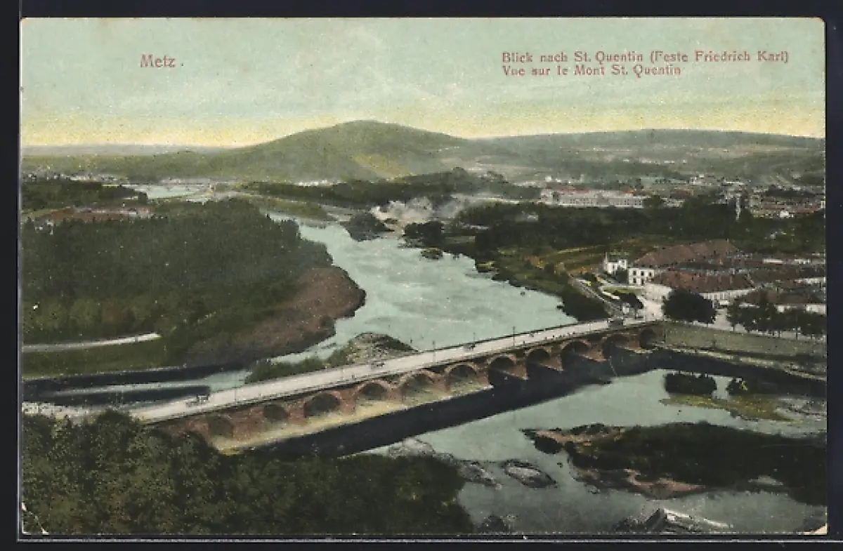 AK Metz, Vue sur le Mont St. Quentin et la rivière avec pont en avant-plan
