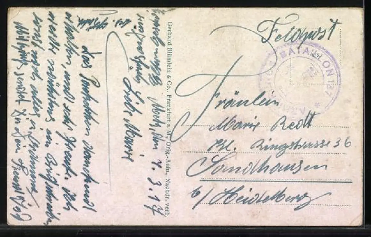 Personenbezogene Daten auf der Rückseite der Karte wurden durch blauen Textmarker unkenntlich gemacht. Die blauen Stellen sind auf die Vorderseite durchgeweicht und wirken sich negativ auf das Postkartenfoto aus