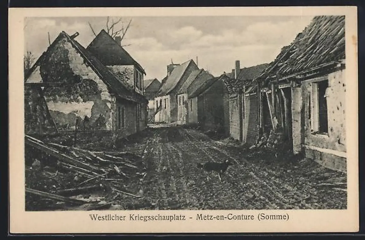 AK Metz-en-Conture /Somme, Westlicher Kriegsschauplatz, Strassenpartie mit zerstörten Häusern