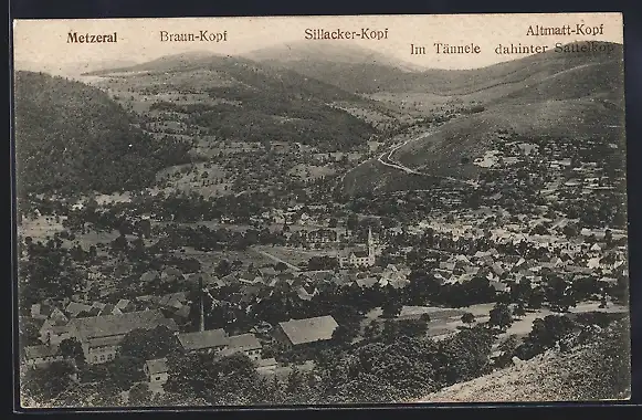 AK Metzeral, Ortsansicht mit Braun-Kopf und Sillacker-Kopf