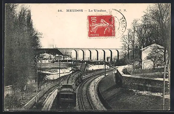 AK Meudon, Le Viaduc et train sur les voies ferrées en hiver