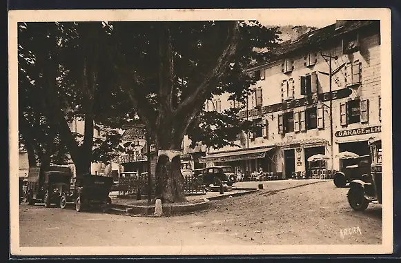AK Meyrueis, La Place avec voitures anciennes et arbres majestueux