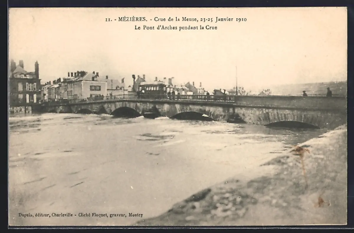 AK Mézières, Le Pont d`Arches pendant la crue de la Meuse, janvier 1910