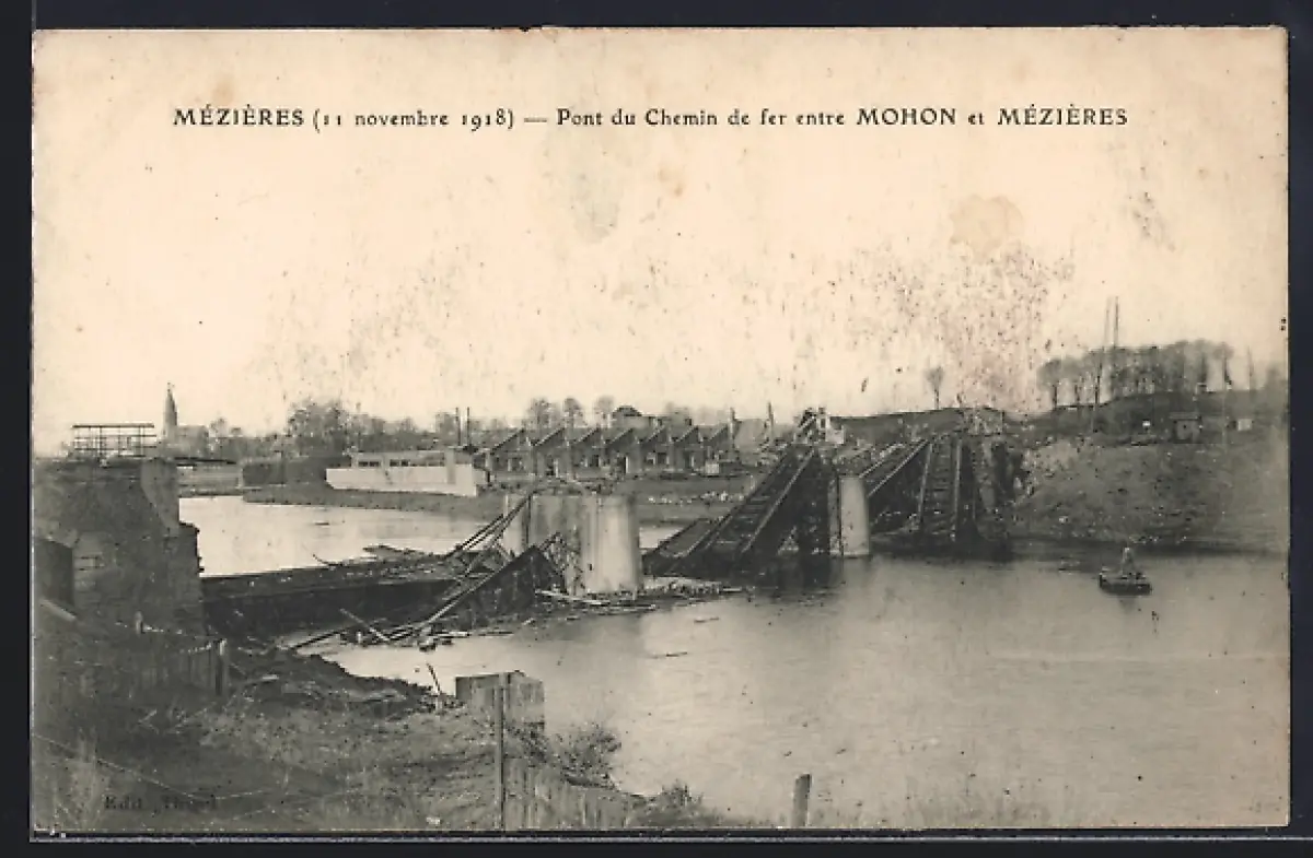AK Mézières, Pont du Chemin de fer entre Mohon et Mézières après destruction, 11 novembre 1918