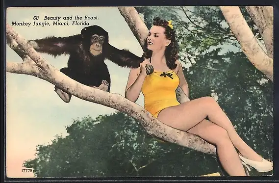 AK Miami, Frau und Affe sitzen auf dem Ast, Beauty and the Beast, Monkey Jungle