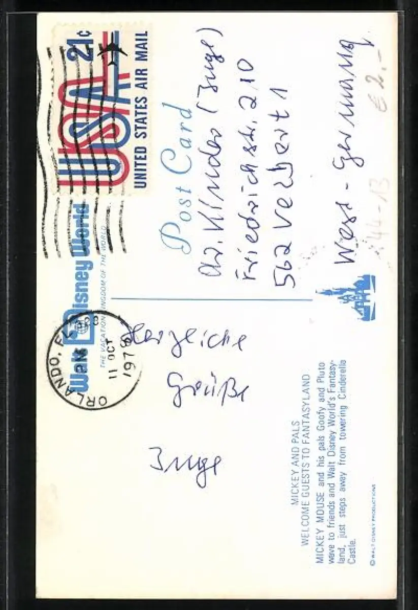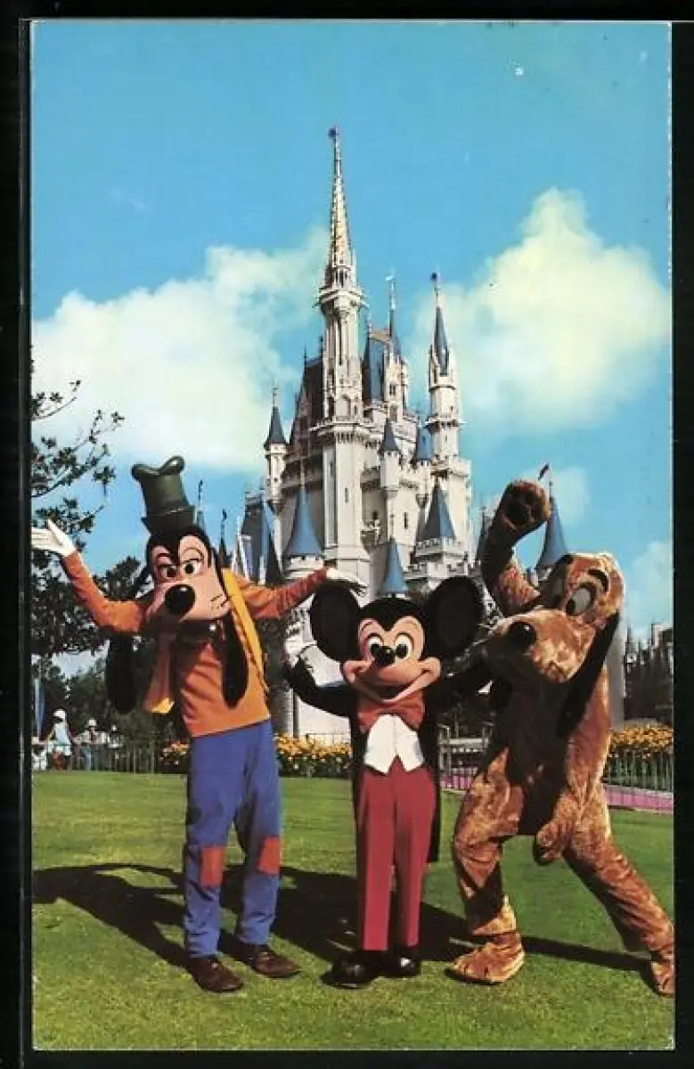 AK Mickey Mouse, Goofy and Pluto wave to friends and Fantasyland, Comic