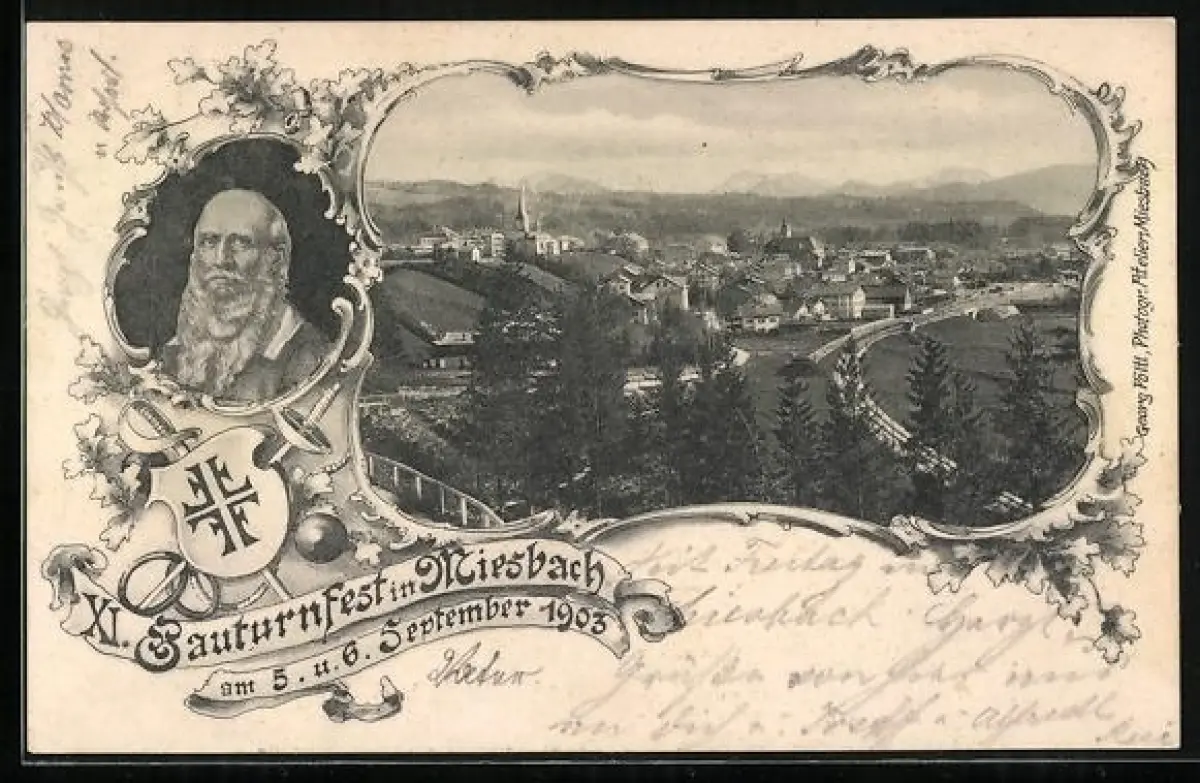 AK Miesbach, XI. Gauturnfest Miesbach 1903, Ortsansicht aus der Vogelschau