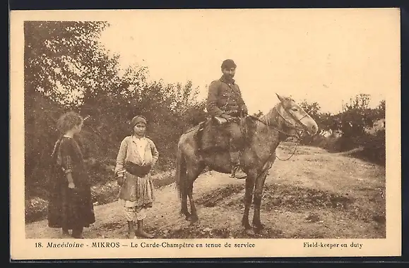 AK Mikros, Macédoine, Le Garde-Champêtre en tenue de service, ein Hilfspolizist zu Pferde