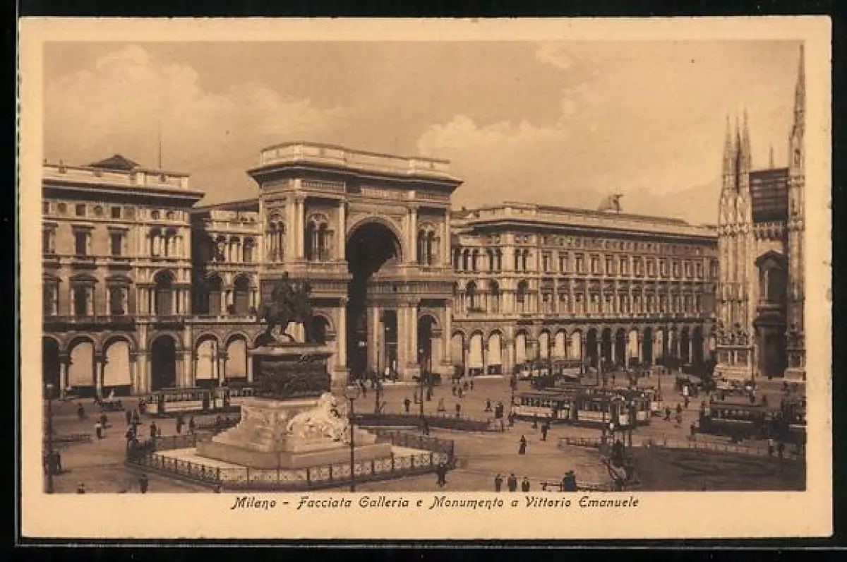 AK Milano, Facciata Galleria e Monumento a Vittorio Emanuele, Strassenbahn