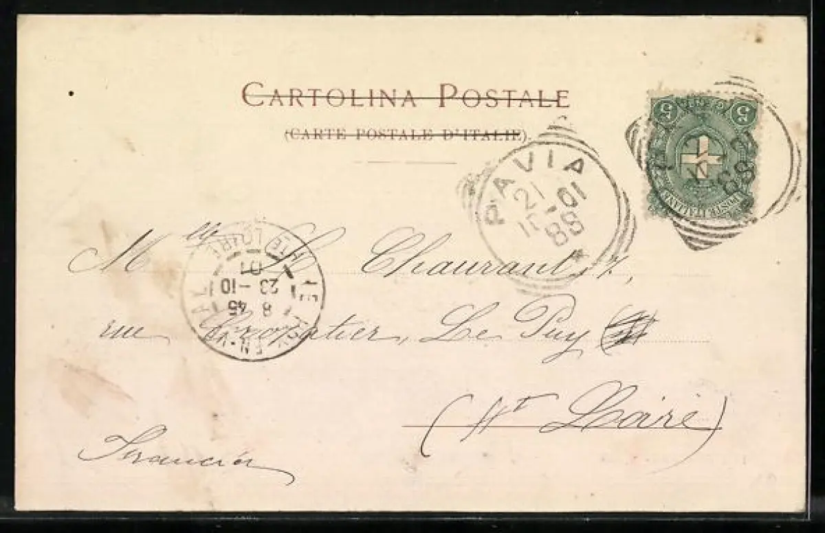 Personenbezogene Daten auf der Rückseite der Karte wurden durch blauen Textmarker unkenntlich gemacht. Die blauen Stellen sind auf die Vorderseite durchgeweicht und wirken sich negativ auf das Postkartenfoto aus