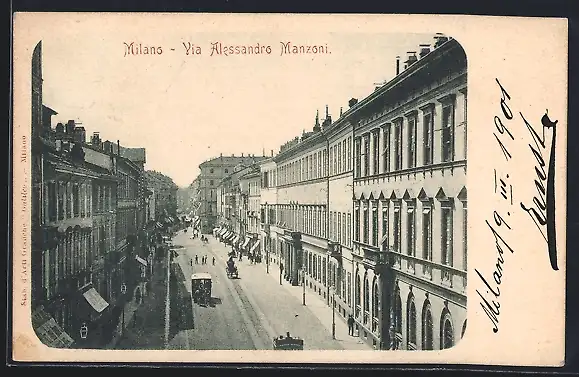 AK Milano, Via Alessandro Manzoni, Pferdebahn