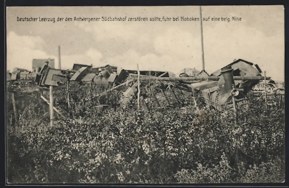 AK Militärbahn, Deutscher Leerzug der den Bahnhof von Antwerpen zerstören sollte ist bei Hoboken auf eine Mine gefahren