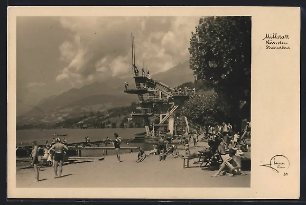 AK Millstatt /Kärnten, Strandbad mit Springturm, Badegästen