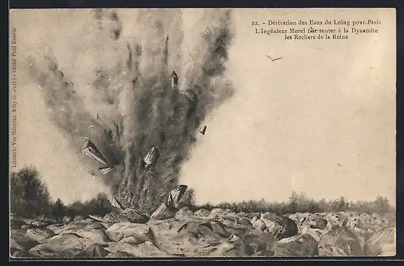 AK Milly, Derivation des Eaux du Loing pour Paris, Morel fait sauter a la Dynamite les Rochers de la Reine