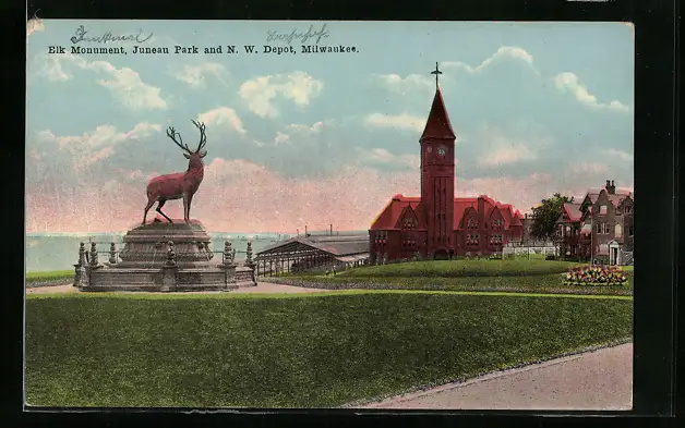 AK Milwaukee, WI, Elk Monument, Juneau Park and N. W. Depot