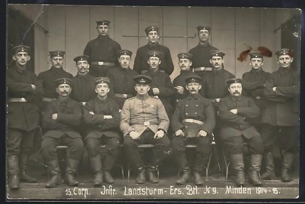AK Minden / Weser, 15. Corp. Inf. Landsturm-Ersatz-Btl. 9., Gruppenfoto 1914/15