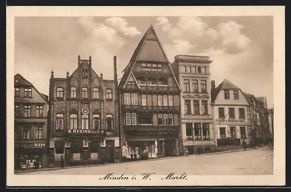 AK Minden i. Westf., Markt mit Kleiter`s Restaurant, Cafe Rheingold und Haus Schmieding