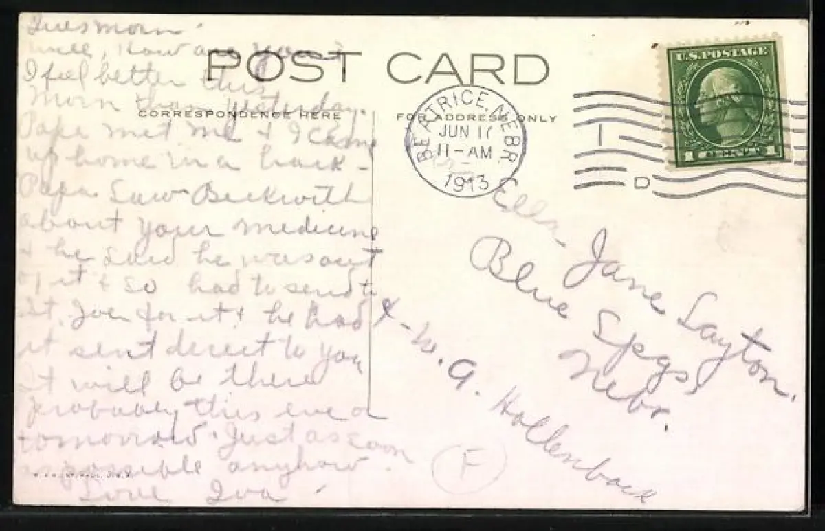 Personenbezogene Daten auf der Rückseite der Karte wurden durch blauen Textmarker unkenntlich gemacht. Die blauen Stellen sind auf die Vorderseite durchgeweicht und wirken sich negativ auf das Postkartenfoto aus