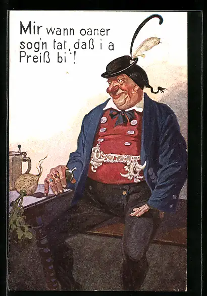 AK Mir wann oaner sog'n tat, dass i a Preiss bi'!, Mann in Tracht mit Rübe und Bierkrug