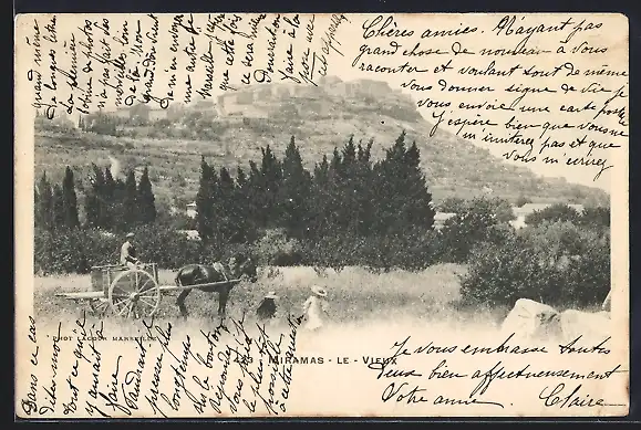 AK Miramas-le-Vieux, Vue champêtre avec charrette et paysages bucoliques