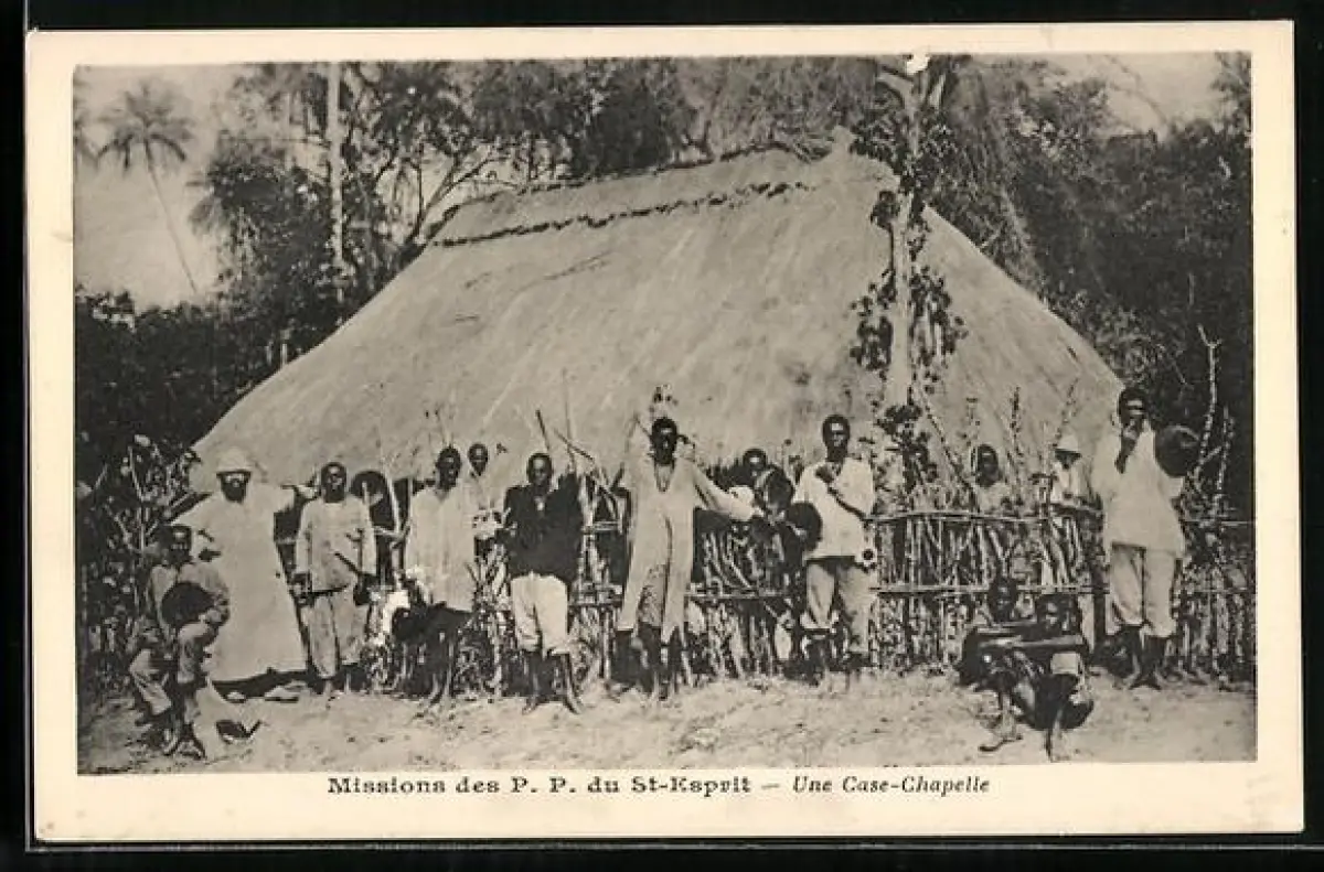 AK Missions des P. P. du St-Esprit, Une Case-Chapelle, Männer vor Kapelle