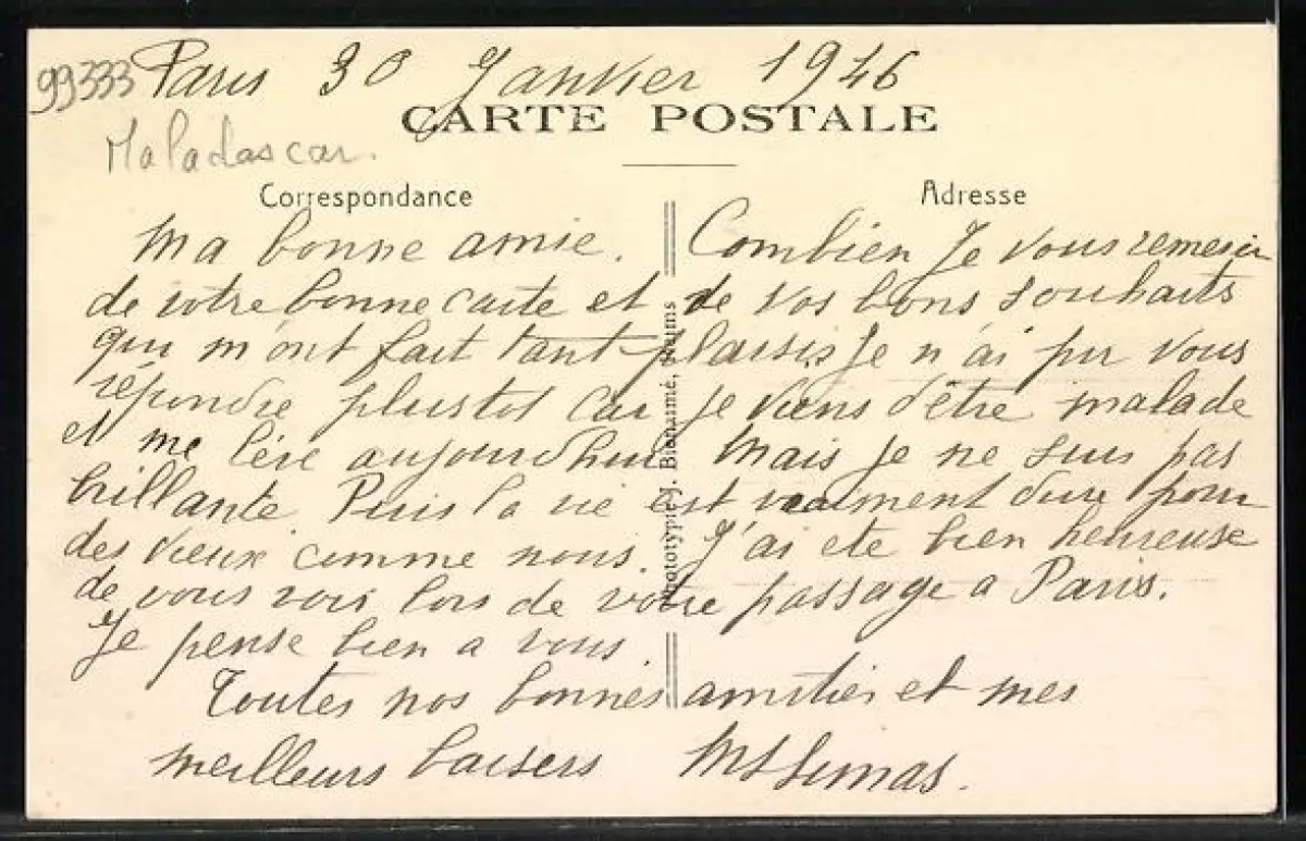 Personenbezogene Daten auf der Rückseite der Karte wurden durch blauen Textmarker unkenntlich gemacht. Die blauen Stellen sind auf die Vorderseite durchgeweicht und wirken sich negativ auf das Postkartenfoto aus