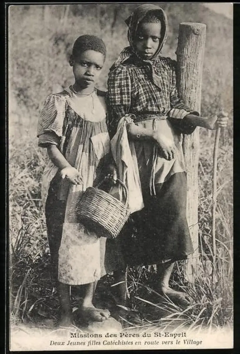 AK Missions des Pères du St-Esprit, Deux Jeunes filles Catéchistes en route vers le Village