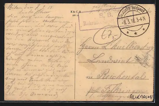 gelaufen 1918, Eckknicke li. unten und re. oben, guter Zustand