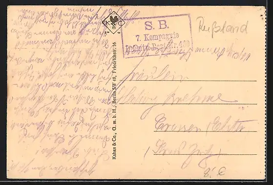 Personenbezogene Daten auf der Rückseite der Karte wurden durch blauen Textmarker unkenntlich gemacht. Die blauen Stellen sind auf die Vorderseite durchgeweicht und wirken sich negativ auf das Postkartenfoto aus
