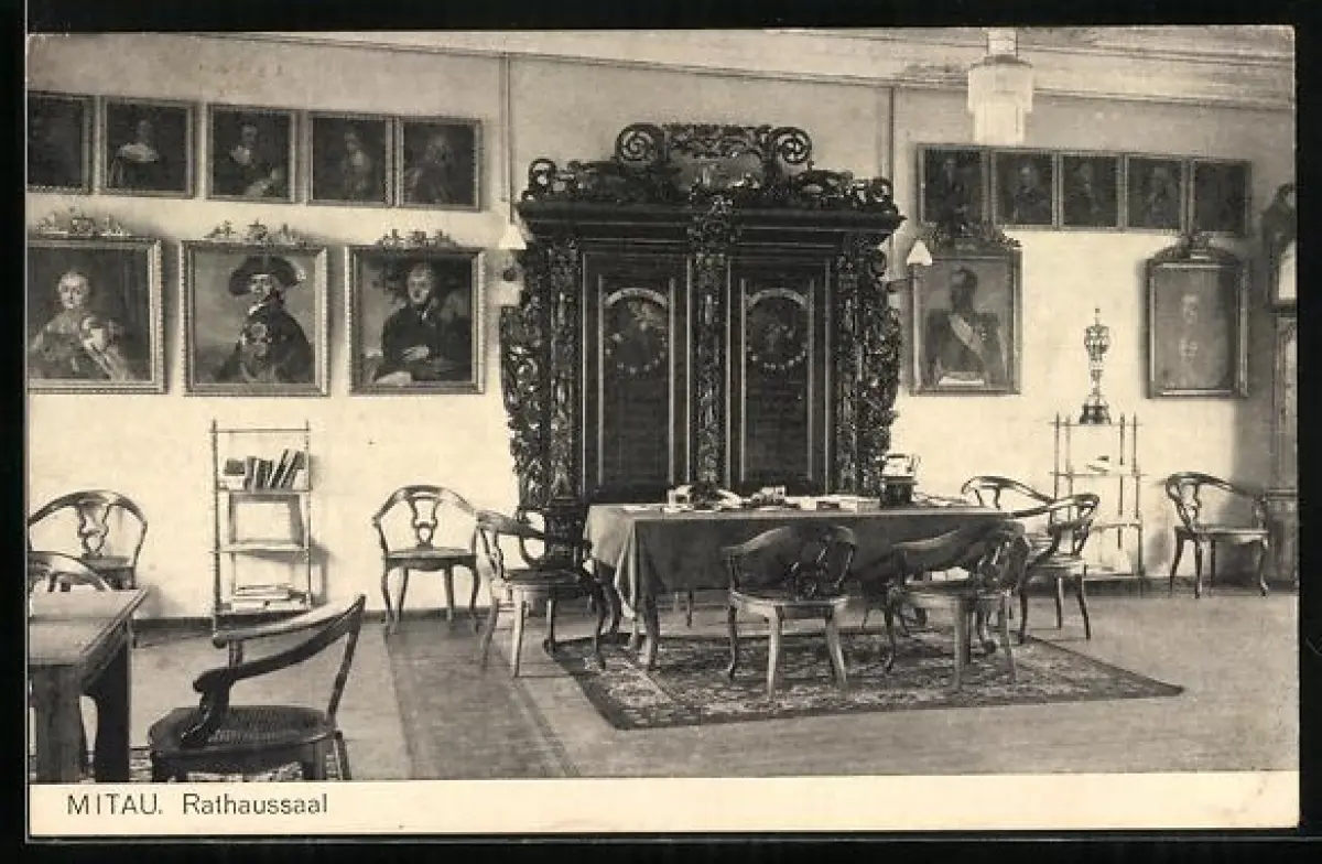 AK Mitau, Rathaussaal mit Gemälden und Tisch